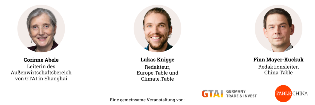 Diese und weitere Fragen diskutieren Corinne Abele, Leiterin des Bereichs Außenwirtschaft von Germany Trade & Invest in Shanghai, Lukas Knigge, Redakteur beim Europe.Table und Climate.Table und Finn Mayer-Kuckuk, Redaktionsleiter des China.Table.