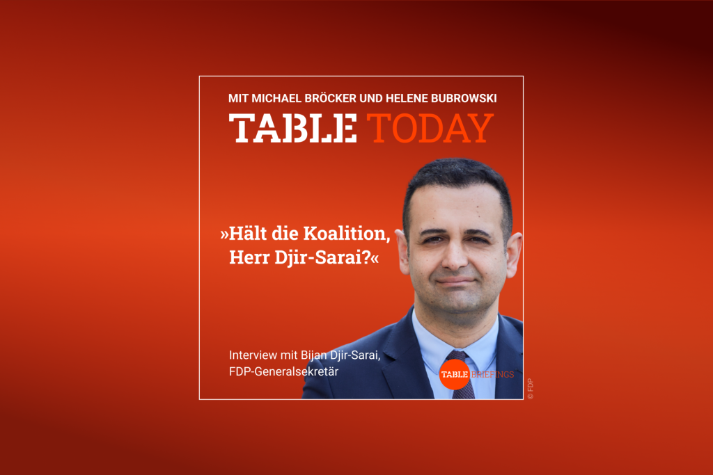 Die Zukunft der Ampel-Koalition hängt für FDP-Generalsekretär Bijan Djir-Sarai davon ab, ob die Koalitionspartner bereit sind, Maßnahmen zur Stärkung der Wirtschaft zuzustimmen. „Die entscheidende Frage ist: Gelingt es uns, für Deutschland eine Wirtschaftswende einzuleiten?“, sagte Djir-Sarai im Podcast Table.Today. Dafür müssten „alle Partner ihren Beitrag leisten“. Auf die Frage, ob die Regierung bis zur nächsten regulären Bundestagswahl im Herbst 2025 bestehen bleibe, sagte der Generalsekretär: „Ich bin kein Prophet, sondern Politiker.“